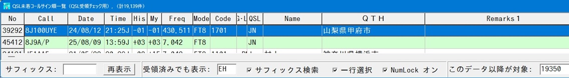 上図のようにQSL未着コール順一覧を表示させ、アクティブな状態(最前面に表示)にします。QSLカード受領チェックの状態です。