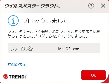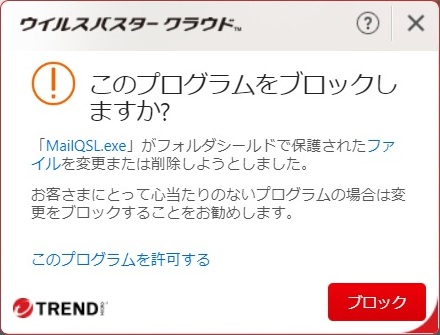 それから、連続して送信したり、大量に受信をすると、ウイルスバスターからランサムウエア扱いをされたこともありました。これについては、本ソフトを「許可」することにより、その後は問題ありませんでした。