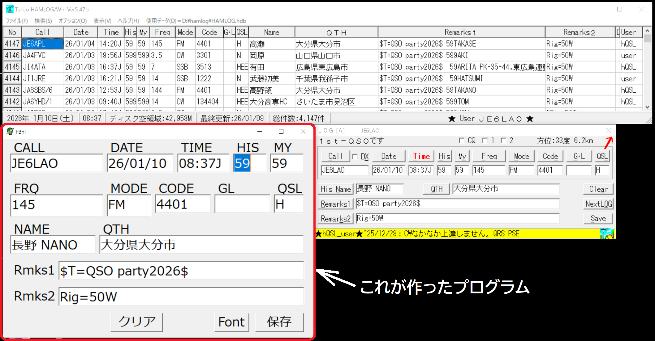 sendmessageを使ってハムログ入力窓と同期するようにしています。