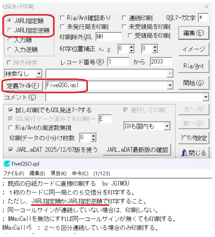 JARL指定順か、JARL指定逆順にチェックを入れる